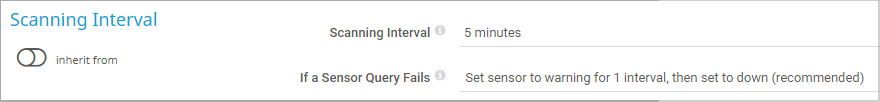 Select the number of scanning intervals that the sensor has time to reach and to check a device again if a sensor query fails. Depending on the option that you select, the sensor can try to reach and to check a device again several times before the sensor shows the Down status. This can avoid false alarms if the monitored device only has temporary issues. For previous scanning intervals with failed requests, the sensor shows the Warning status. Choose from: