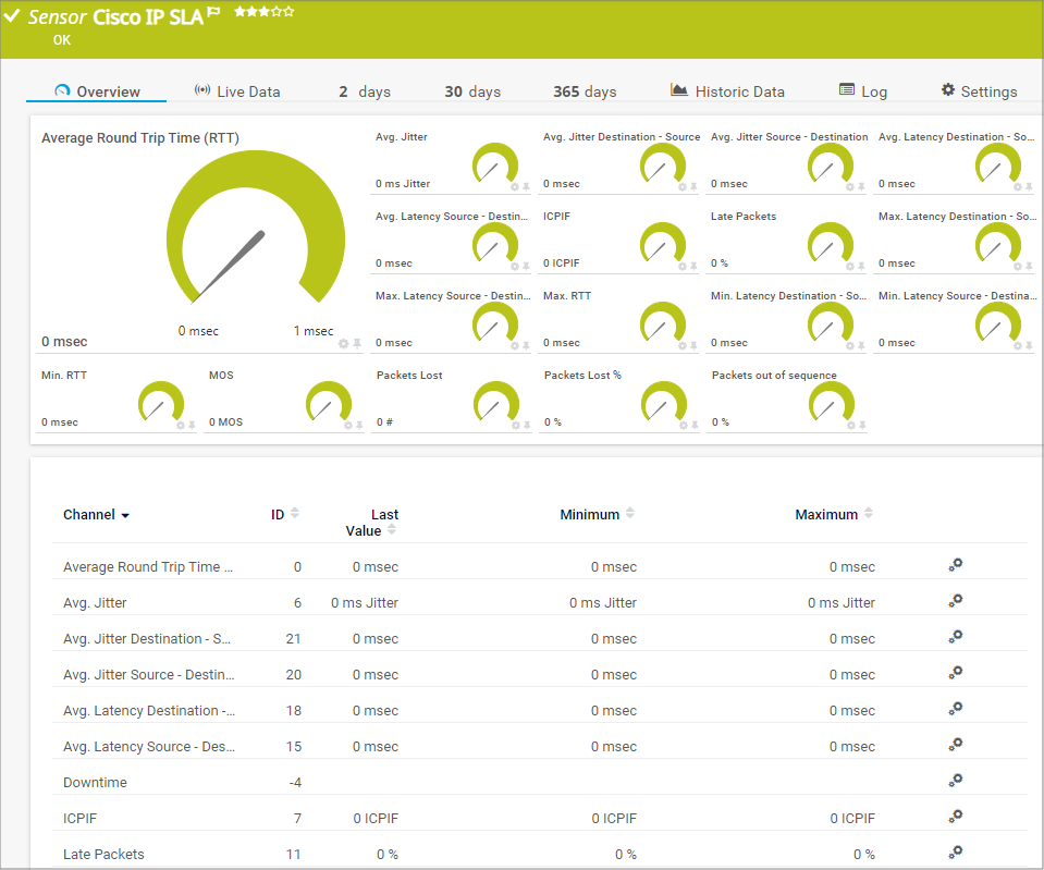 The Cisco IP SLA sensor monitors Voice over IP (VoIP) network parameters using IP service level agreements (SLA) from Cisco via the Simple Network Management Protocol (SNMP).