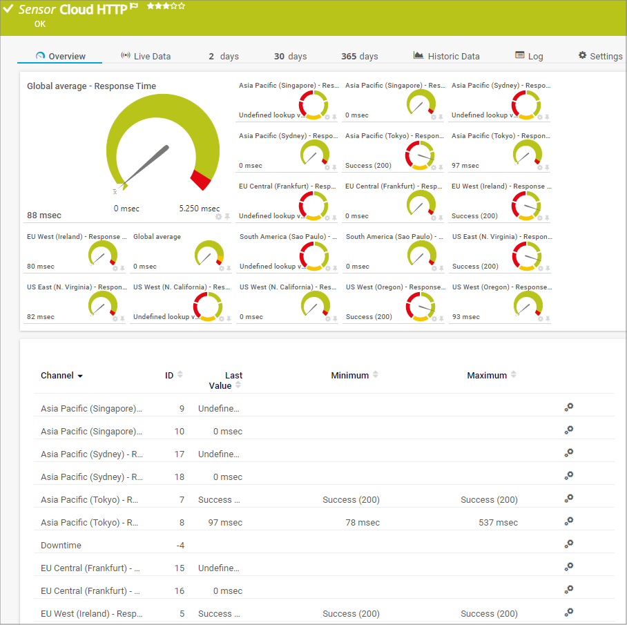 The Cloud HTTP sensor monitors the loading time of a web server via HTTP from different locations worldwide via the PRTG Cloud. The locations are distributed among five continents around the globe.
