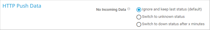 This setting is only visible if you select Switch to down status after x minutes above. Enter a time threshold in minutes. If this time elapses, the sensor shows the Down status if it does not receive a push message within this time span.