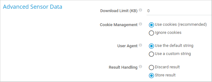 This setting is only visible if you enable Use a custom string above. Enter the string that the sensor uses as the user agent when it connects to the target URL.