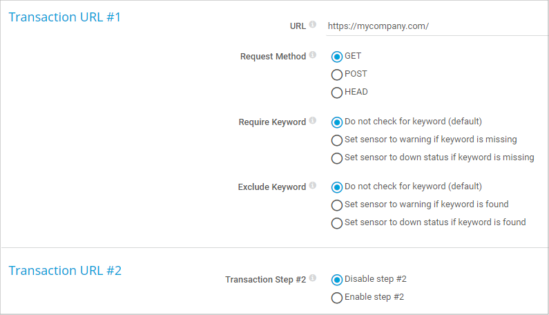 You can define up to 10 different transaction URLs, which are all called in a row. If the transaction can be completed, the sensor shows the Up status. Using this mechanism, you can set up extended monitoring with multiple URLs.