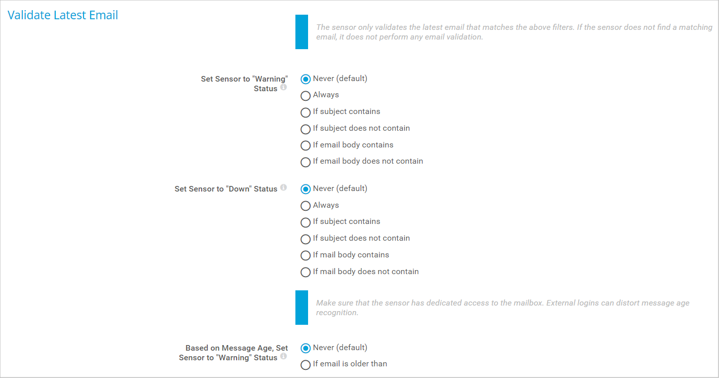 - Set sensor to up status (default): Show the Up status if the sensor does not find any email in the mailbox that matches the filters.