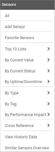 Open a list of sensors filtered by sensor type. Hover over By Type to show other options. Follow the alphabetical menu path that is specific to your setup to view a sensor list that contains only sensors of one specific sensor type.