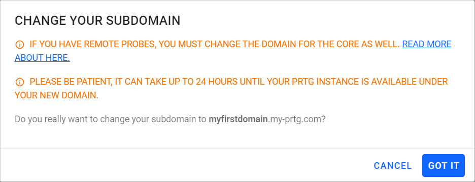 1. Enter a new domain name such as myfirstdomain. If you enter myfirstdomain as the domain name, for example, your PRTG Hosted Monitor instance is reachable under myfirstdomain.my-prtg.com.