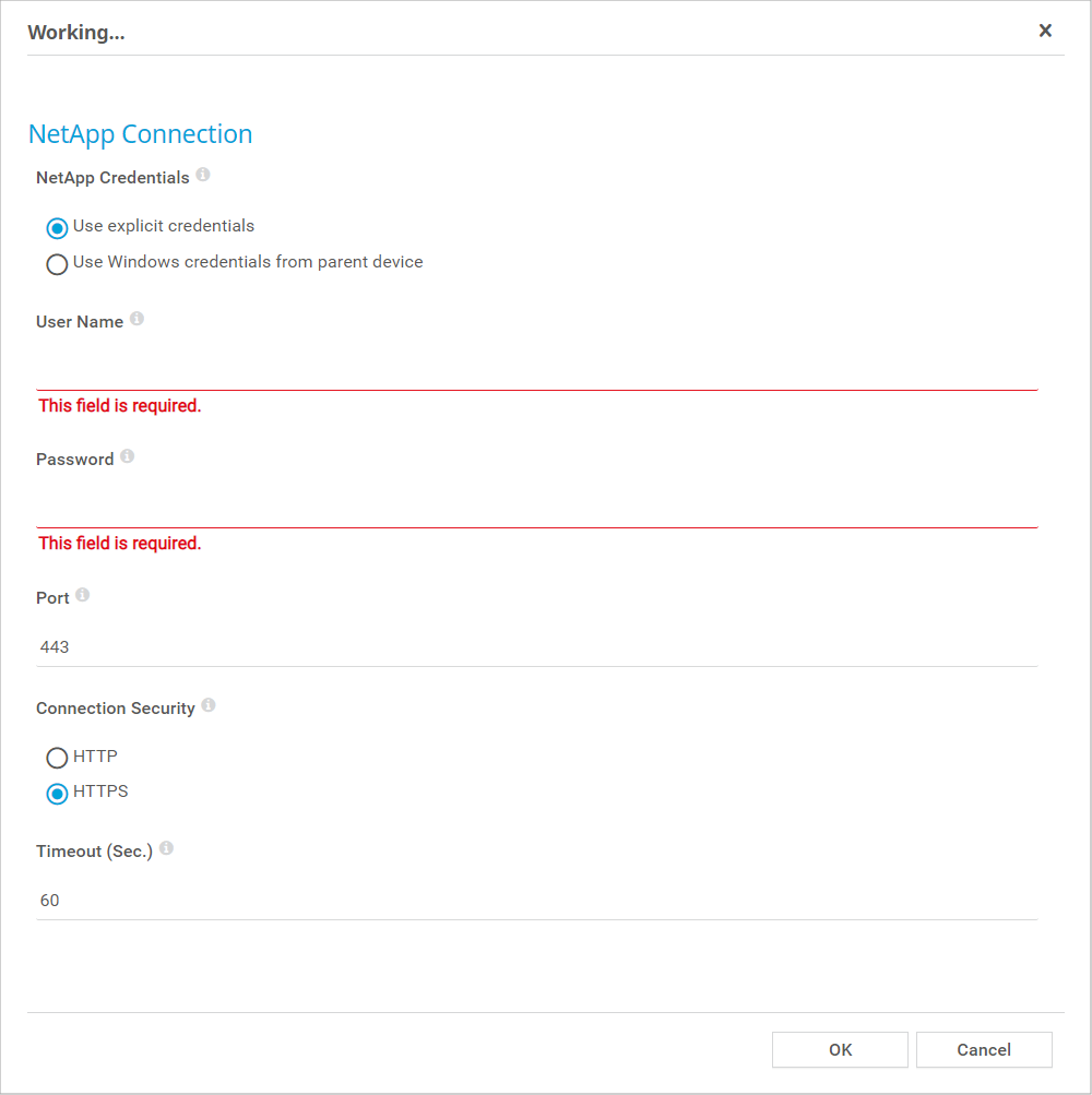 This setting is only visible if you select Use explicit credentials above. Enter the password of the user for access to the NetApp API. Enter a string.