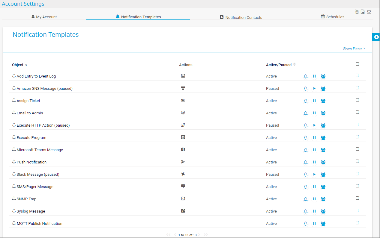 Click the Notification Templates tab to show a list of all notification templates, what actions they perform, and their status (active or paused). To edit a notification template, enable the check box next to the notification template and choose from the following options.