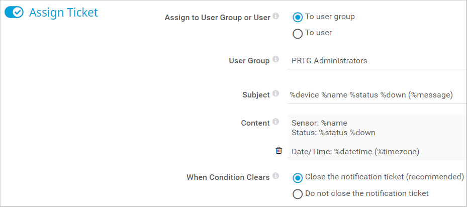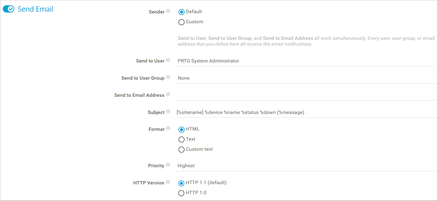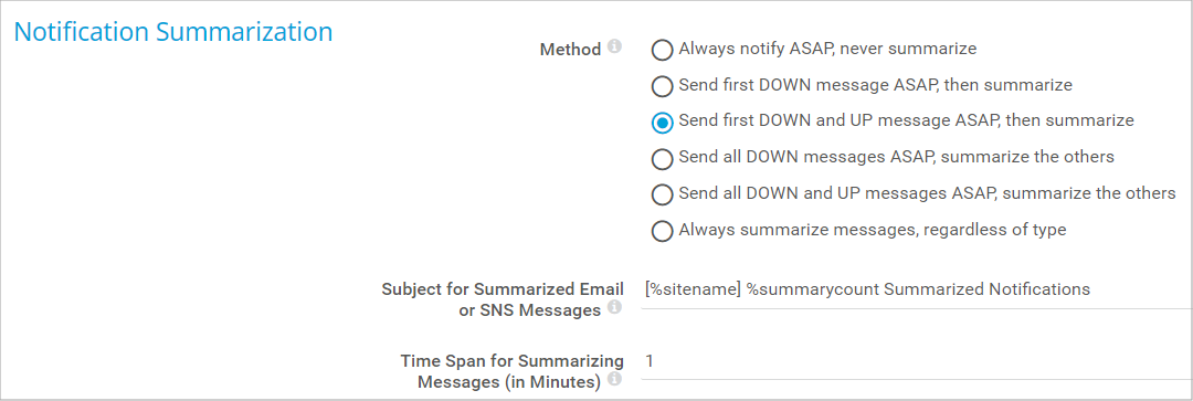 Define a subject that PRTG includes when it sends summarized notifications. The default subject is [%sitename%] %summarycount Summarized Notifications.