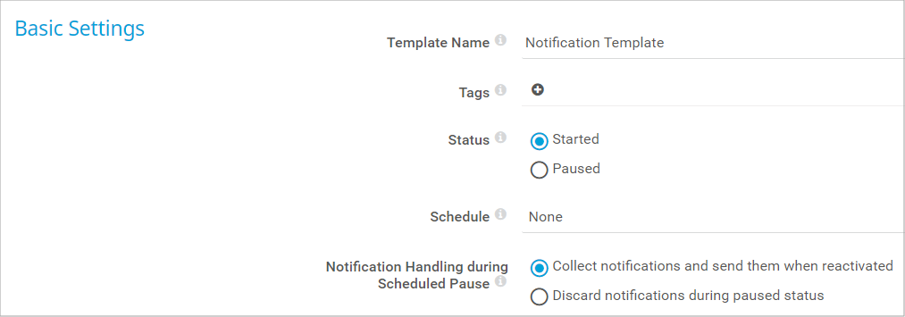 Define if you want to use a schedule to activate a notification template only during specific time spans. This way you can pause notifications, for example, during regular maintenance periods or system restarts. Choose between: