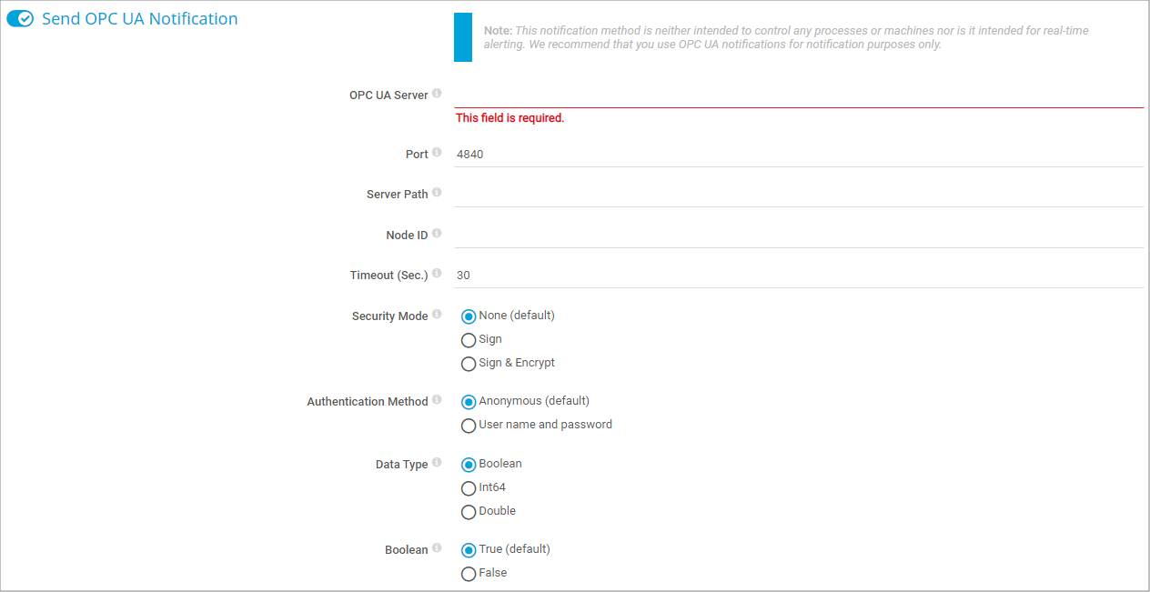 If you select Boolean as Data Type, the data type on the OPC UA server must be Boolean.