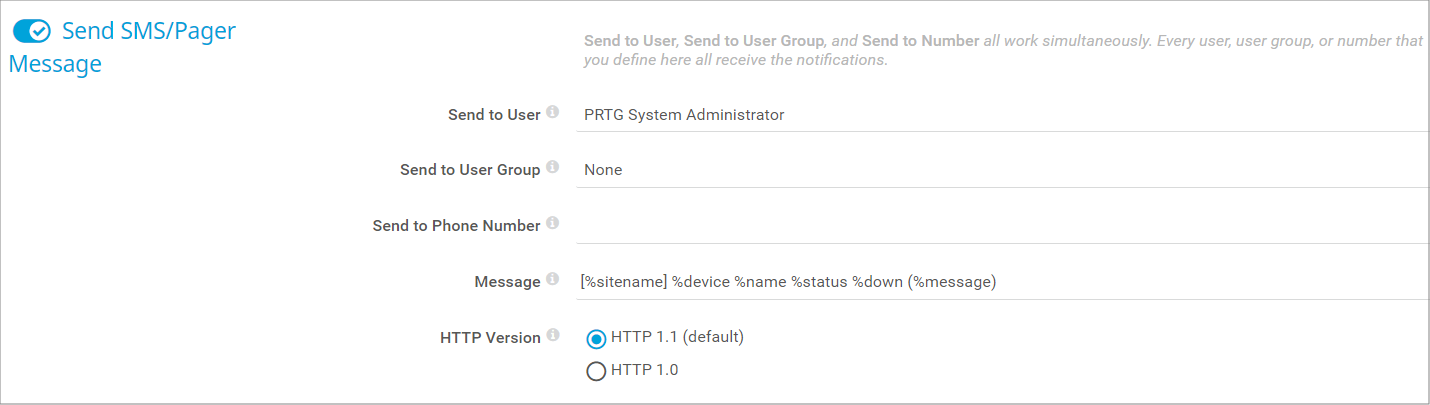 - Send first DOWN message ASAP, then summarize: When PRTG receives several DOWN triggers, it sends the first notification immediately, then it continues to summarize notification triggers into one message, regardless of the sensor status.