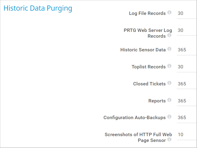 Define for how long PRTG keeps historic sensor data for all sensors. Enter a value in days.