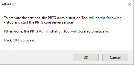 After you change settings, click Save & Close. A new dialog box appears where PRTG asks you to agree to restart the PRTG core server service. Click OK to proceed.