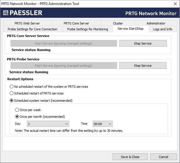 - No scheduled restart of the system or PRTG services: Do not automatically perform a scheduled restart of services. We recommend that you manually restart the PRTG core server system every few weeks. You can also restart the PRTG core server service and PRTG probe service under Administrative Tools in the PRTG web interface.