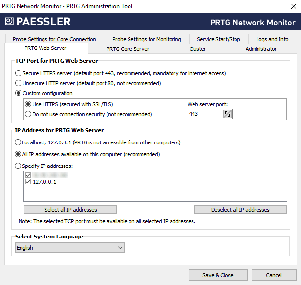 - All IP addresses available on this computer (recommended): Use all IP addresses that are available on the PRTG core server system and enable access to the PRTG web server for all of these IP addresses.