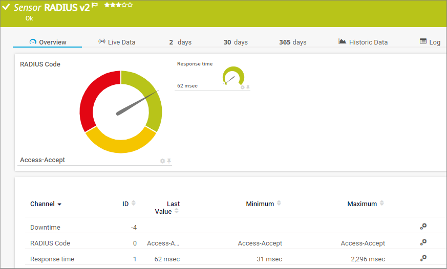 The RADIUS v2 sensor monitors a Remote Authentication Dial-In User Service (RADIUS) server according to RFC 2865.