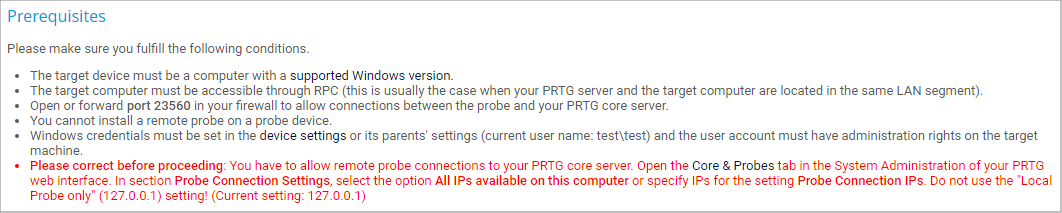 Because your remote probe needs to connect to your PRTG core server, PRTG needs to accept incoming remote probe connections. So, with PRTG Network Monitor, first prepare your PRTG core server before you install the remote probe.