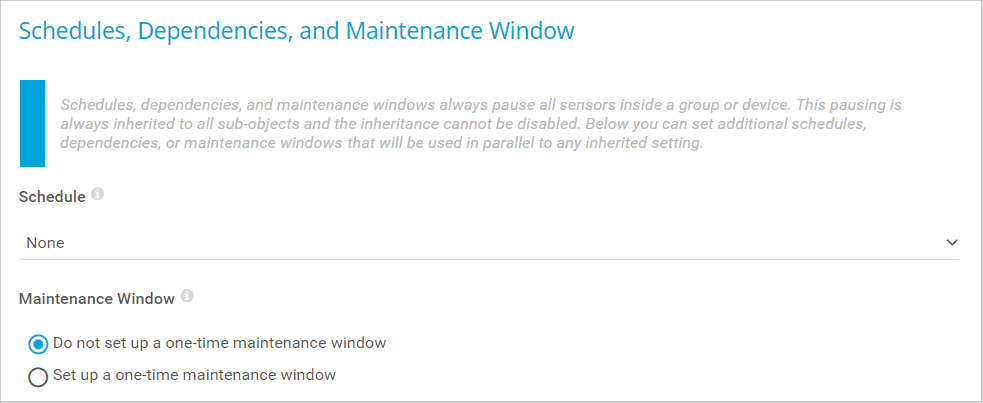Select if you want to set up a one-time maintenance window. During a maintenance window, monitoring stops for the selected object and all child objects. They show the Paused status instead. Choose between:
