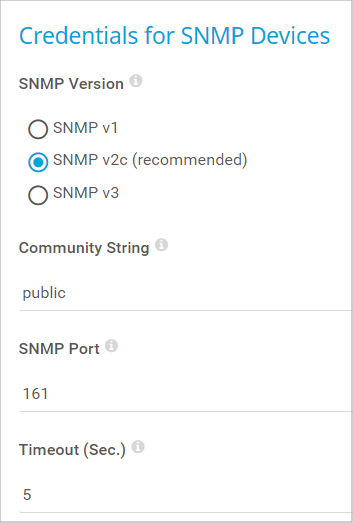 This setting is only visible if you select SNMP v1 or SNMP v2c (recommended) above. Enter the community string of your device. This is like a clear-text password for simple authentication.