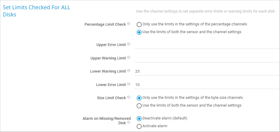 In this section, you can set limits that are valid for all channels and all drives. With limits, you can define when the sensor shows the Warning or Down status, depending on the data provided by all drives that this sensor monitors. If you want to individually define limits for separate channels, use the limit settings in the channel settings.