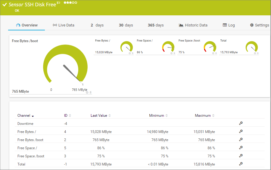 The SSH Disk Free sensor monitors the free space on disks of a Linux/Unix system using Secure Shell (SSH).