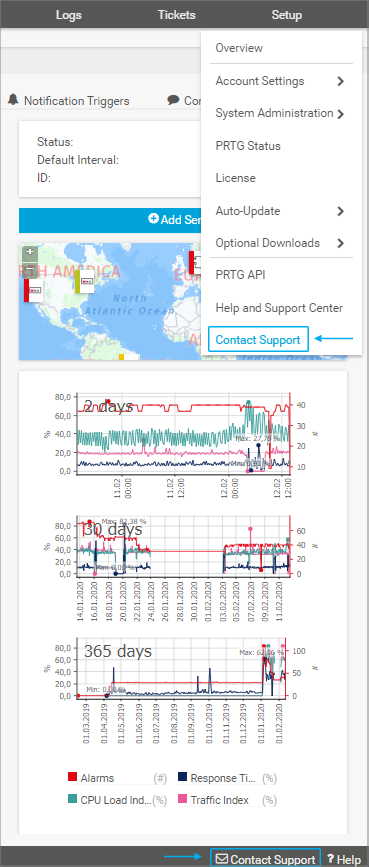 For technical issues, use the Contact Paessler Support / Send Your Feedback to Paessler form in PRTG. To open the form, select Setup | Contact Support from the main menu bar. You can also open the form via Contact Support in the footer on every page in the PRTG web interface.