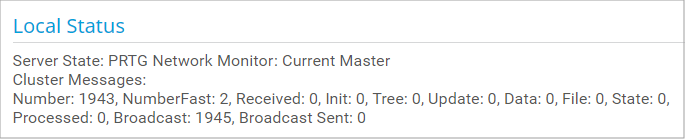 If you run PRTG in a cluster, this shows information for the system of the cluster node you are logged in to. You must log in to the primary master node to see synchronization data for remote probe connections.