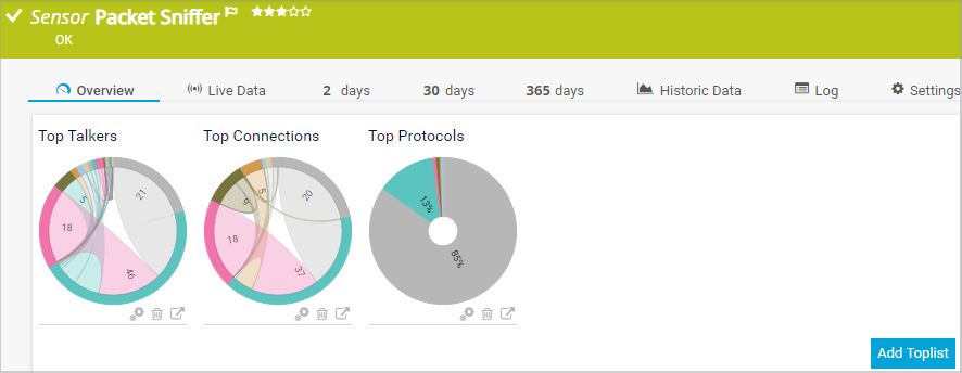 Toplists are only available for Flow and Packet Sniffer sensors. PRTG displays Toplist on the sensor's Overview tab.