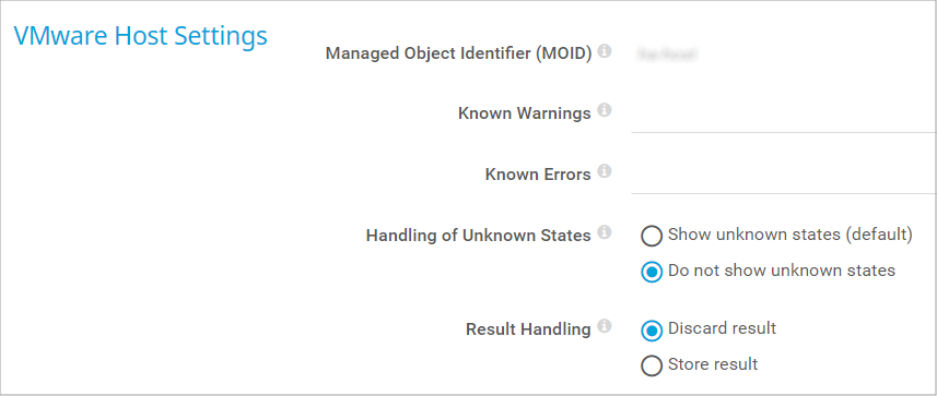 Enter one or more warning messages from the VMware host that you want to ignore. Use semicolons (;) as separators, for example, Power Supply 7;Power Supply 8. Enter a string or leave the field empty.