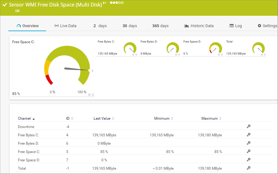 The WMI Free Disk Space (Multi Disk) sensor monitors the free disk space of one or more drives via Windows Management Instrumentation (WMI).