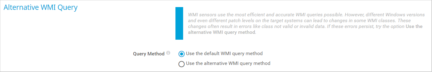 - Use the alternative WMI query method: Use an alternative method to query WMI for better compatibility if WMI sensors return errors such as class not valid or invalid data.