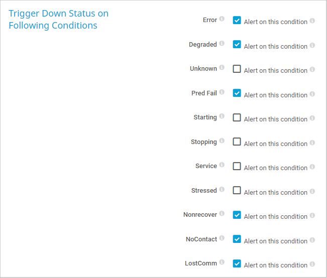 Set the sensor to the Down status if the share returns a predicted fail status. This indicates that an element works properly but predicts a failure (for example, a SMART-enabled hard drive). A share in this status is still operational.